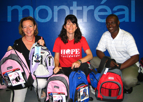 Anne Du Sault has given up her vacation time to go and help several countries where HOPE worldwide was offering help programs (South Africa, Ivory Coast, India, Russia). She has been in charge of the Quebec chapter since January 2009. We see her here at the Petite-Bourgogne in Montreal giving school bags to children.